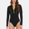 Vestido De Baño para mujer Negro entero con copas removibles, cierre frontal y detalles neón en costuras y logo. Esta prenda tiene control de abdomen para estilizar la figura con el Vestido De Baño para mujer Negro