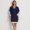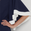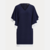Vestido de crepé azul de la nueva colección Lauren primavera verano 2023. Un vestido práctico y versátil, para llevar tanto en la oficina como para salir con amigas. Volantes en las mangas con borde a contraste blanco. Corte ajustado. Hasta la rodilla. La talla IT 44 tiene un largo de 89,5 cm y unas mangas de 29,8 cm. Cremallera trasera central oculta con cierre de corchetes.